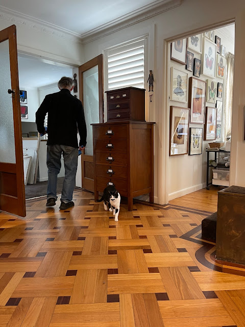 We’re constantly trying to make our place more liveable and workable. While this is something that tends to happen in fits and starts, it does add up. This week Shane Jones lugged a tall plan cabinet that was formerly cluttering up our very tiny ground floor office upstairs to the first floor cinema room. It now resides outside my studio, where it will effectively double my storage space for small works on paper. The cabinet replaces a white plinth on which the small set of drawers also shown here was formerly displayed.