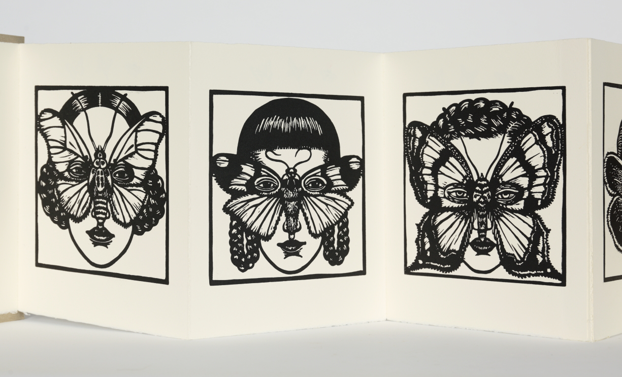Pictured above and below: Women with Wings, 2010, concertina book with linocuts and rubber stamps, a rare volume freshly out of mothballs in readiness for the forthcoming exhibition ARTIST BOOKS & FOLIOS at Stephen McLaughlan Gallery.